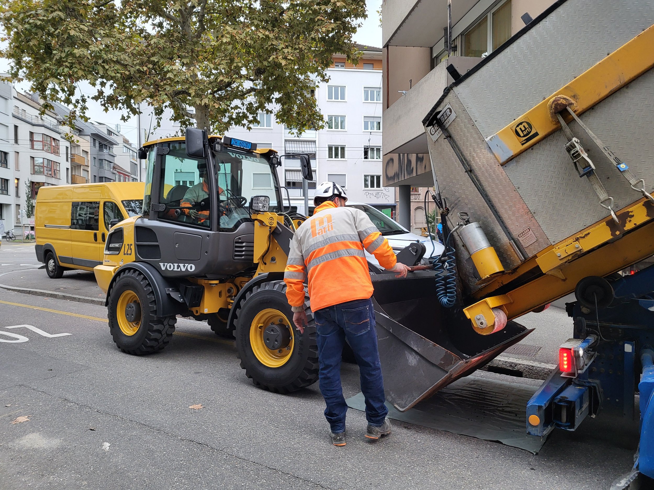 Erster Einsatz eines elektrischen Radbaggers (Hitachi) und eines elektrischen 2.5 m3 Dumpers (Fiori) in der Schweiz